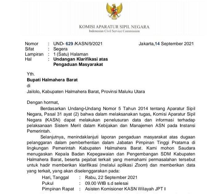 Surat dari KASN nomor : UND-629/KASN/9/2021, tertanggal 14 Februari itu, meminta Bupati James Uang untuk melakukan klarifikasi, soal mutasi jabatan pimpinan tinggi pratama dilingkup pemkab halbar, melalui Zoom Metting pada Rabu (22/9/2021).