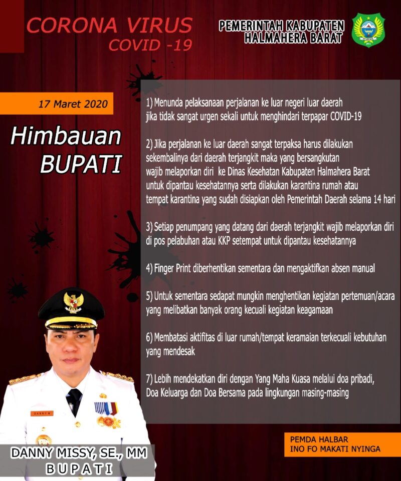 Ketegasan Bupati Danny itu disampaikan melalui himbauan nomor : 443/247/2020, tentang kewaspadaan Virus Civid19. Himbauan itu dikeluarkan berdasarkan radiogram Menteri Dalam Negeri (Mendagri) nomor : 440/2400/SJ tanggal 13 Maret , tentang himbauan penundaan perjalanan dinas ke Luar Negeri, sebagai upaya pencegahan virus corona (Covid19) yang melanda berbagai negara dan beberapa wilayah di Indonesi.