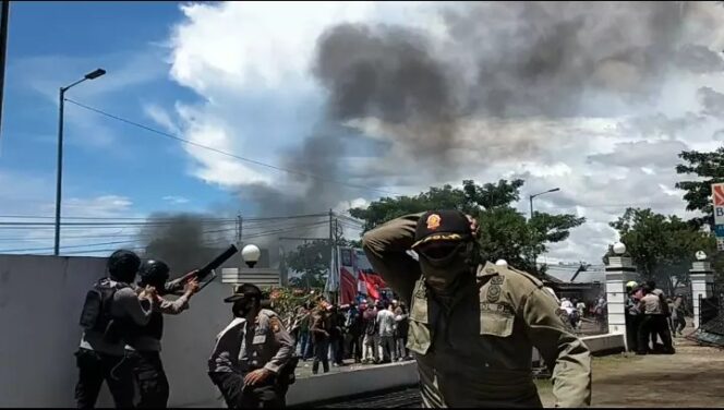 Polisi yang mencoba melerai aksi tersebut, terus dilempari dengan batu. Polisi pun terus membalas dengan tembakan gas air mata.