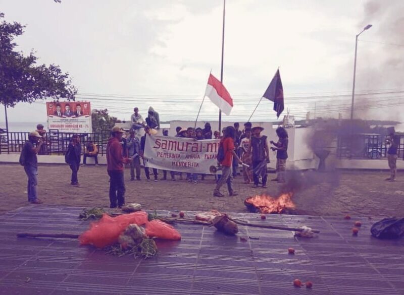 Amatan Media ini, saat menggelar unjuk rasa, masa aksi membawa sayuran dan buah seperti buah kelapa, tomat, sayur kangkung serta sayur bunga pepaya dan membawa spanduk yang bertuliskan “Samurai-MU Pemerintah Amnesia, Petani Menderita”.