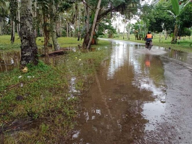 Amatan Media ini, air yang tertampung di jalan umum Desa Daruba Pantai hampir setinggi lutut orang dewasa.(gk)