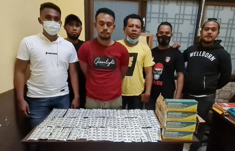 “Dari tangan tersangka Tim Resmob berhasil mengamankan barang Bukti (Babuk) 1 dus besar didalamnya terdapat 14 dus kecil obat penenang Grantusif yang mengandung Dexamethorphan yang dalam per dus kecil terdapat 100 butir, jadi di totalkan trdapat 1400 butir, serta 1 unit Henpon merek Nokia warna Biru Hitam,”pungkasnya. (bur)